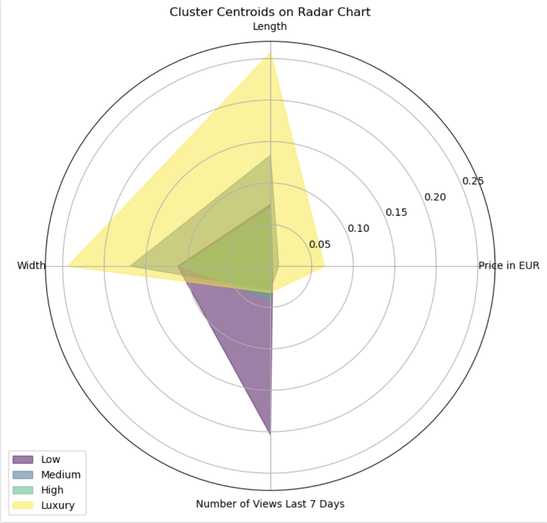 Following the results of the hypothesis testing I used cluster analysis to learn more about the composition of boats viewed in the last week. This type of analysis also focuses on numerical variables, and four groups emerged.